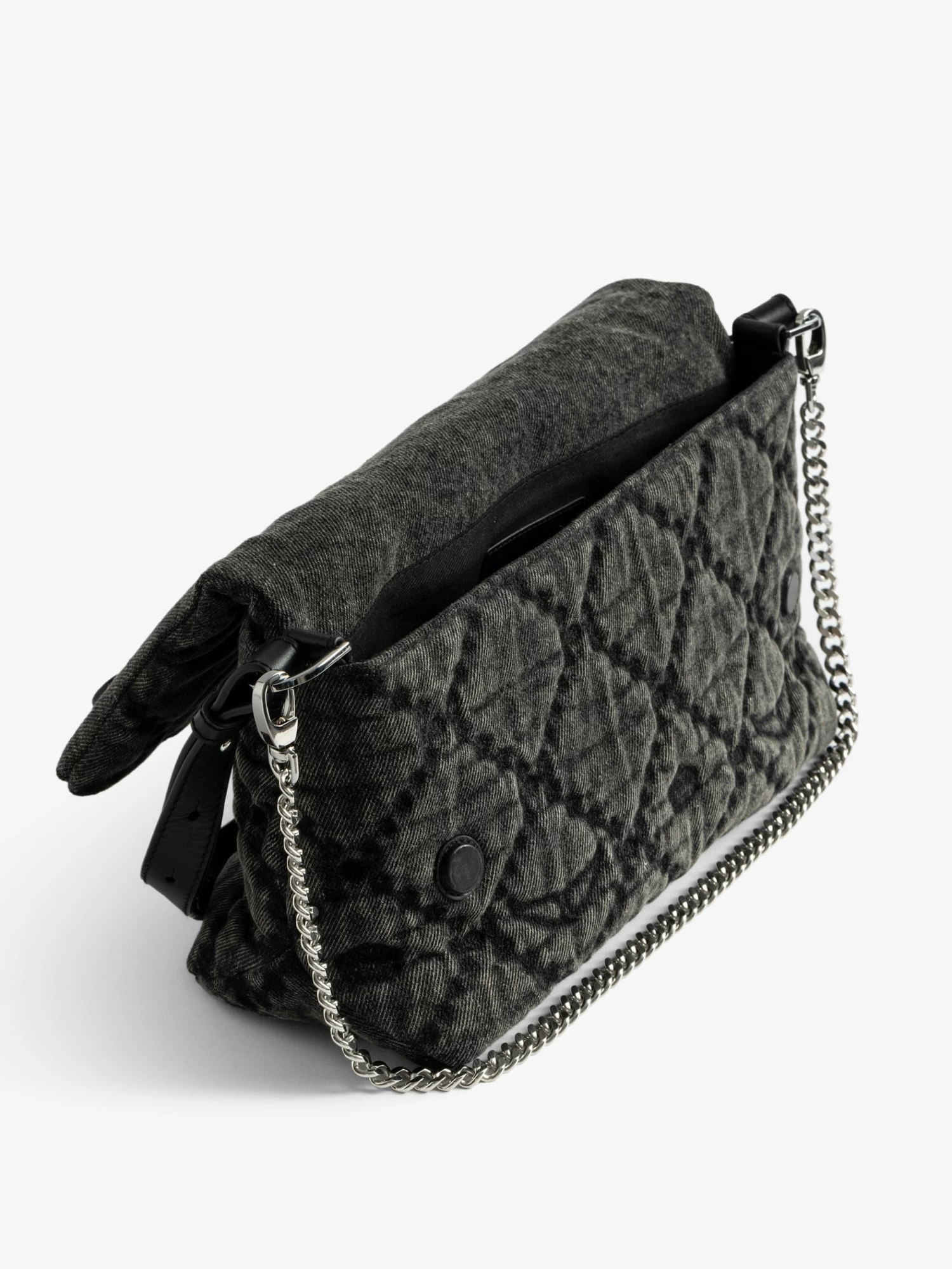 – Washed and quilted denim bag with monogram animation