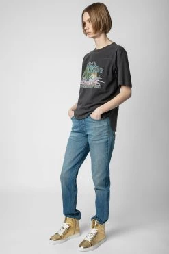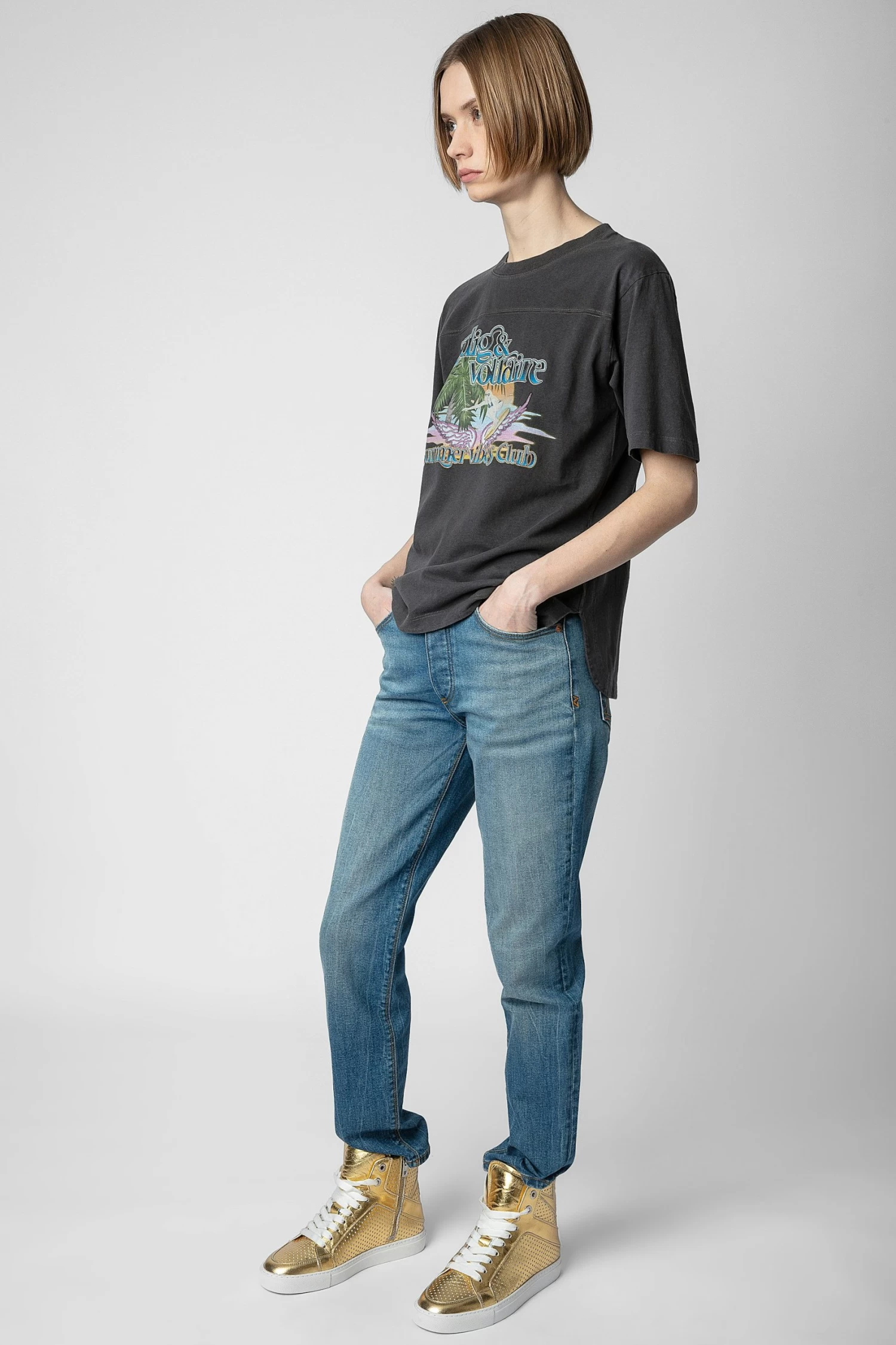 The iconic Zadig&Voltaire signature ZV1747 high-top sneakers has been revamped this season. Featuring perforated stars and designed in gold-tone metallic leather, they are the collection’s must-have casual shoes.